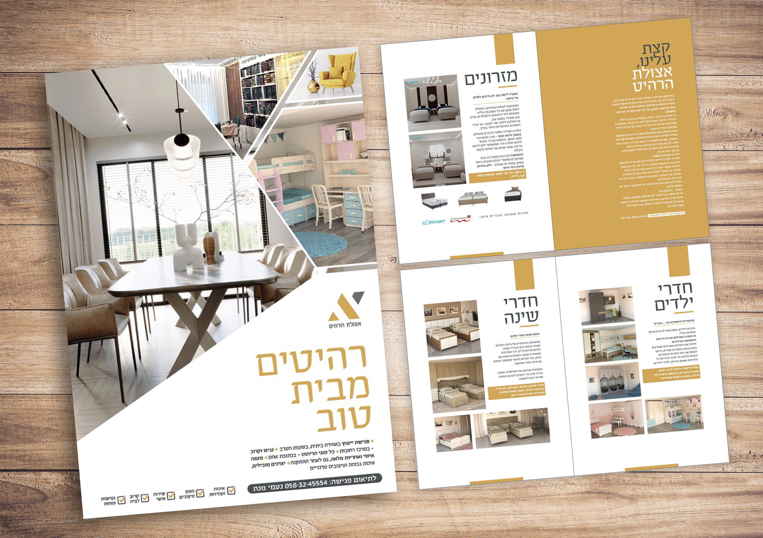 תחום העיסוק: חנות רהיטים משפחתית מרחובות, המציעה מגוון רחב של רהיטים לבית באיכות גבוהה ובמחירים נגישים. ביצענו עבורם פרויקט מיתוג מקיף, שכלל בניית שפה גרפית אחידה, עיצוב קטלוג, דיוורים ישירים ללקוח והפקת חומרים פרסומיים נוספים.